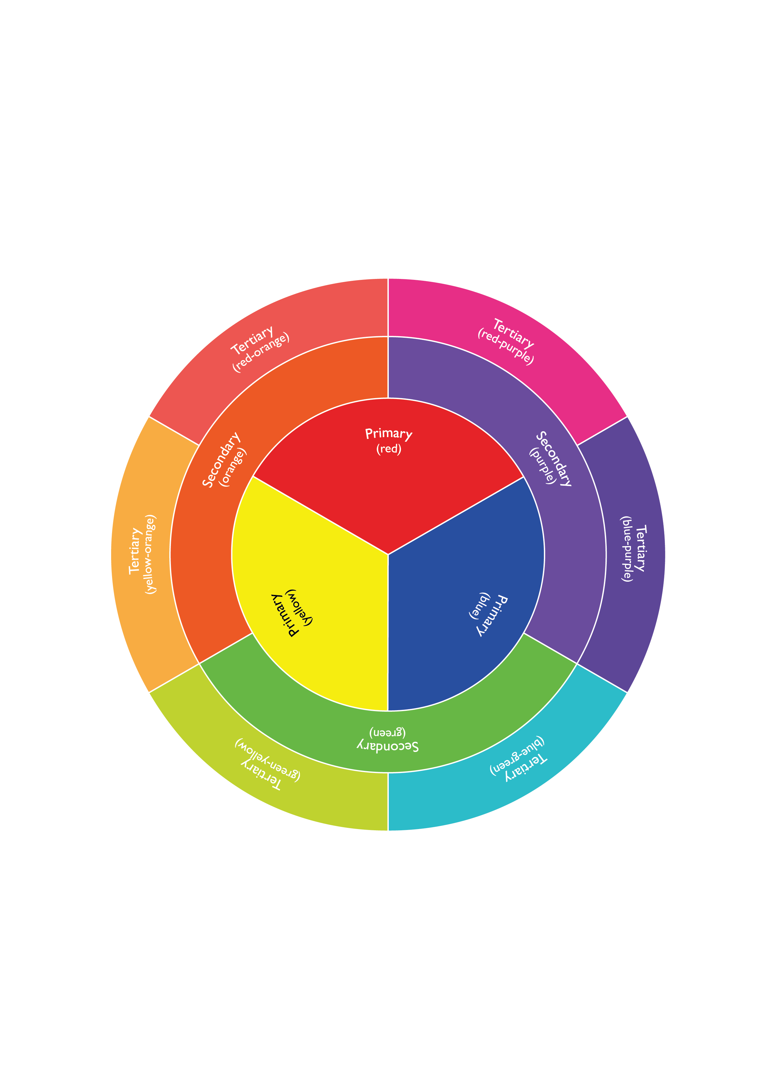 Secondary colours: Green, orange, and purple (formed by mixing primary colours)