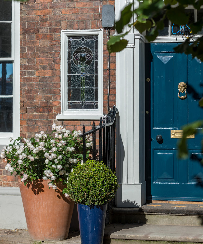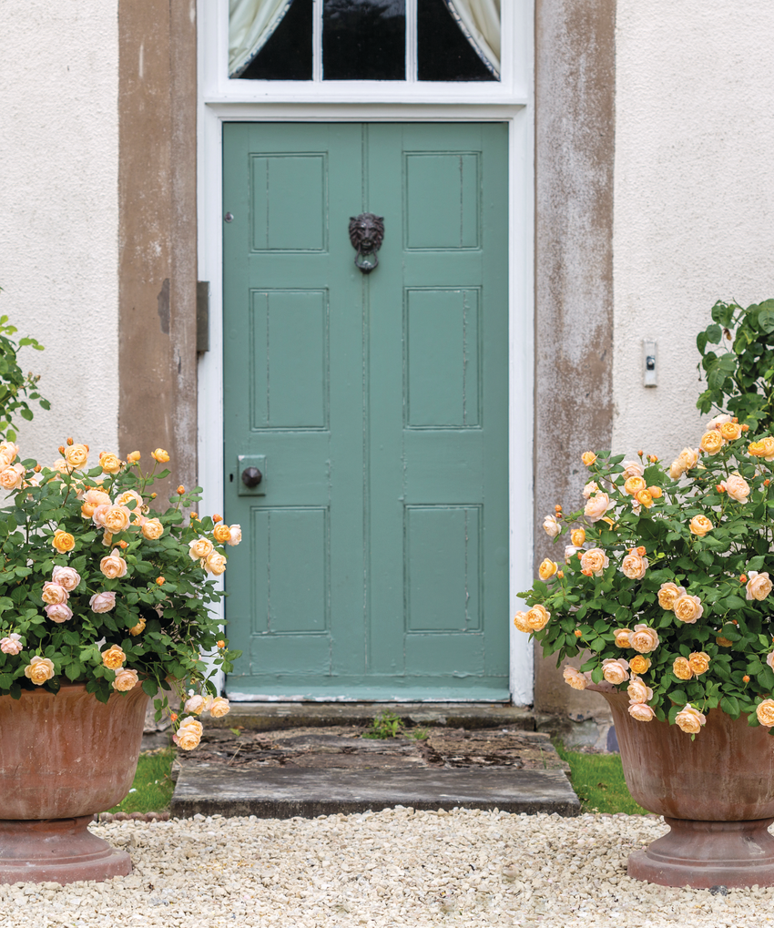 Roses are wonderful plants for growing in pots. Choose a contrasting colour to your door to make a beautiful, colourful feature.