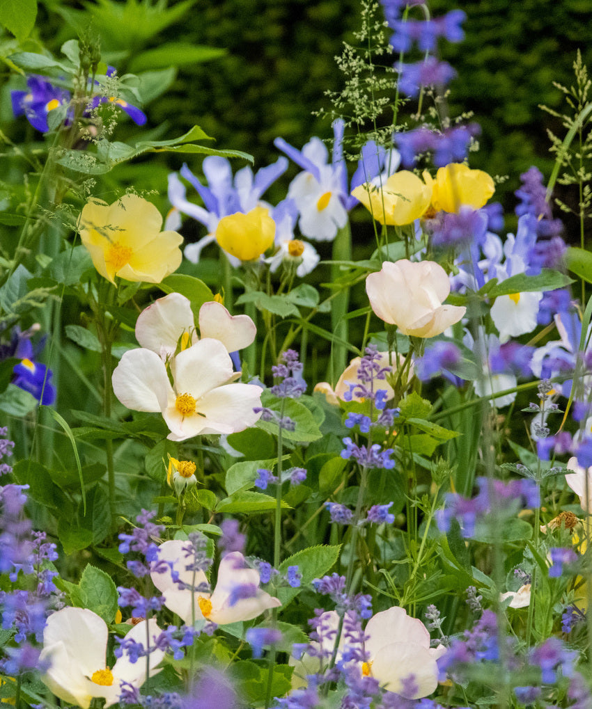 Consider light conditions: Sunlight enhances warm colours, so plant them in sun-drenched spots. Shaded areas benefit from cool colours, which help soften the light and create a more relaxed environment.
