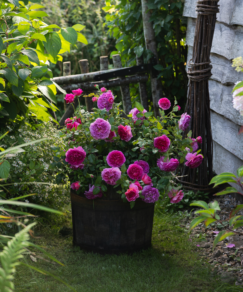 Enhance your mixed borders with the Gabriel Oak rose, known for its captivating, rich, deep pink hues and luscious foliage that will breathe life into your garden beds. For a harmonious look, combine Gabriel Oak with complementary perennials like lavender. With its silvery foliage and elegant purple flowers, lavender beautifully complements the rose's blossoms. You can also add ornamental fountain grass for added texture and fluidity. At the same time, evergreen shrubs can provide a year-round verdant backdrop. Gabriel Oak repeat flowers, ensuring your garden stays vibrant and interesting throughout the flowering season.