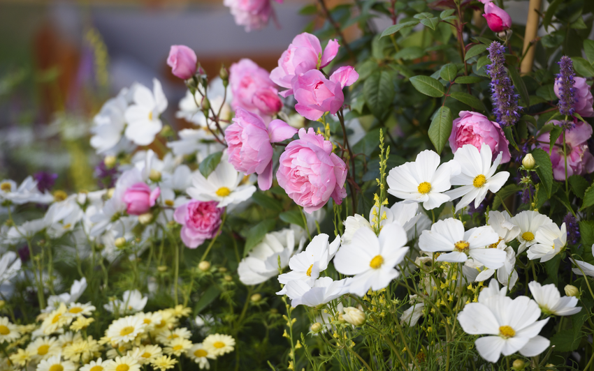 Rosa ‘The Poet’s Wife’, Geranium ‘Kashmir Blue’, Campanula lactiflora, Veronicastrumvirginicum ‘Fascination’, Geranium ‘Derrick Cook’, Artemisia ‘Silver Queen’, Perovskia ‘Blue Spire’, Leucanthemum x superbum ‘Wirral Supreme’, Physostegia virginiana ‘Summer Snow’