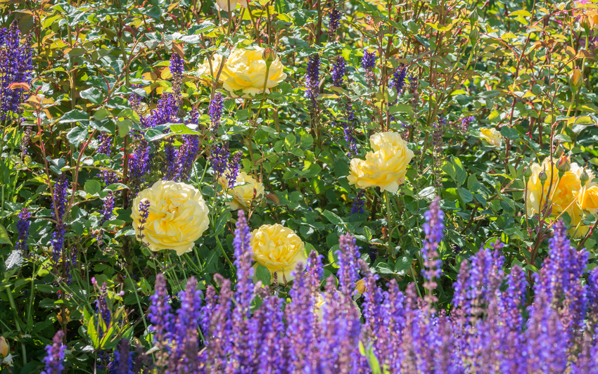 The uplifting yellows of Rosa ‘The Poet’s Wife’ (Auswhirl) conjure up feelings of sunlight and hope, brightening a border and bringing a smile. Becoming paler over time, its blooms need little else in terms of the same colour from their neighbours. A hint of lemon in the centre of the Leucanthemum creates a link to the rose; the rest of this recipe uses silver, white and pale blue-violet with an ever-so-slight touch of the very gentlest of pinks to create a peaceful introduction to early summer. Silvery foliage is a perfect partner to a yellow rose, textural forms bouncing and reflecting light, creating a pretty haze which plays around the base of this planting and then seems to glitter up the spires of taller plants, almost seeming to sparkle as the taller plants move in the breeze of textures, forms and height which anchor this stunning rose to its space.