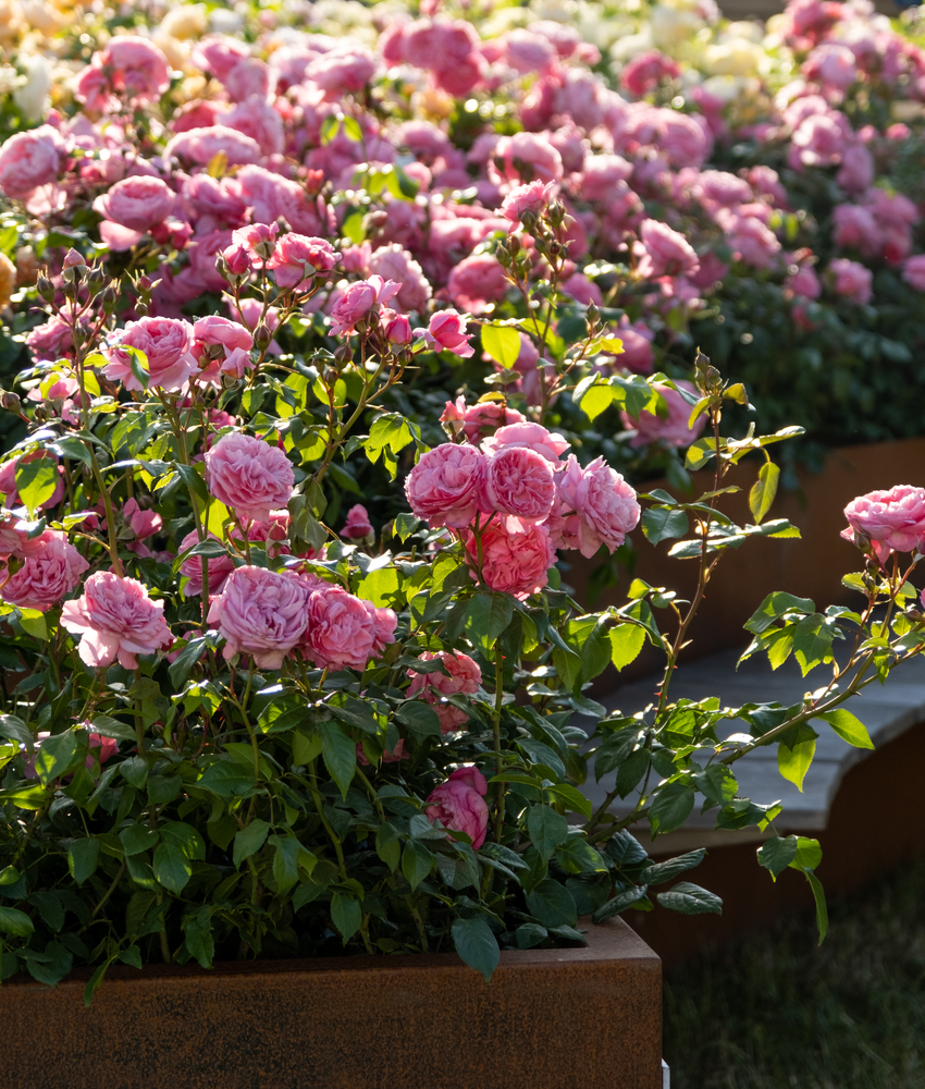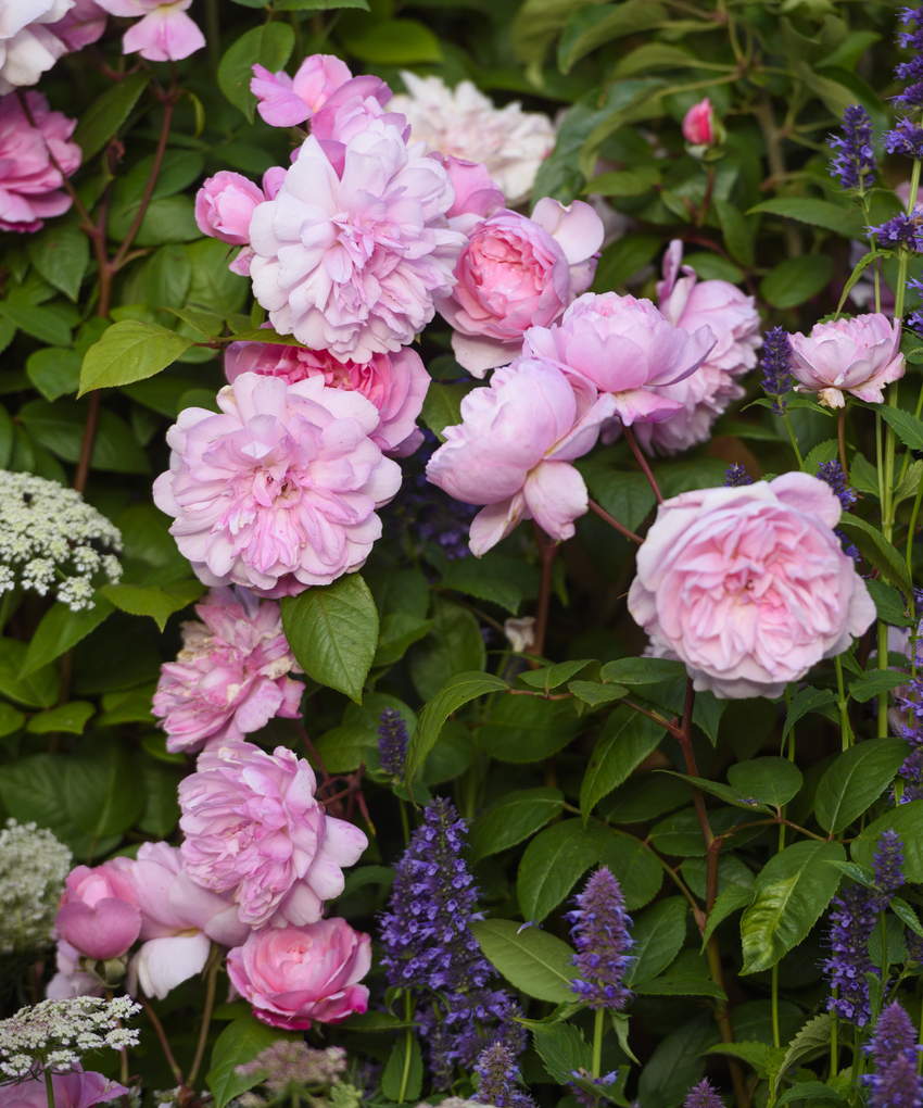 Sue knew she wanted roses in her show garden. After all, “What is a garden without roses?” Not only did they need to be climbers to complement her #knollingwithdaisies design, but she also needed them to be almost thornless. Sue explained she had not always realised thornless roses existed and so this revelation, along with discovering a new tool online (best described as long-handled secateurs), revolutionised her approach to gardening with roses. We were delighted to help her choose a practically thornless variety in Mary Delany (Ausorts), which also led her to incorporate another ten varieties into her own garden on the Welsh coast.