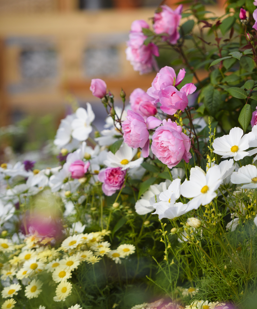 Sue’s chosen rose, Mary Delany, not only has very few thorns, but it also possesses a number of other attributes that align perfectly with the concept behind her design. Bearing large sprays, laden with light pink, its loose double blooms are of utmost delicacy, which enhances its overall look and feel. The use of this gentle and rather unusual rose harmonised beautifully with the cornucopia of daisies and herbaceous perennials, which worked together to create the English country garden look Sue had set out to achieve.