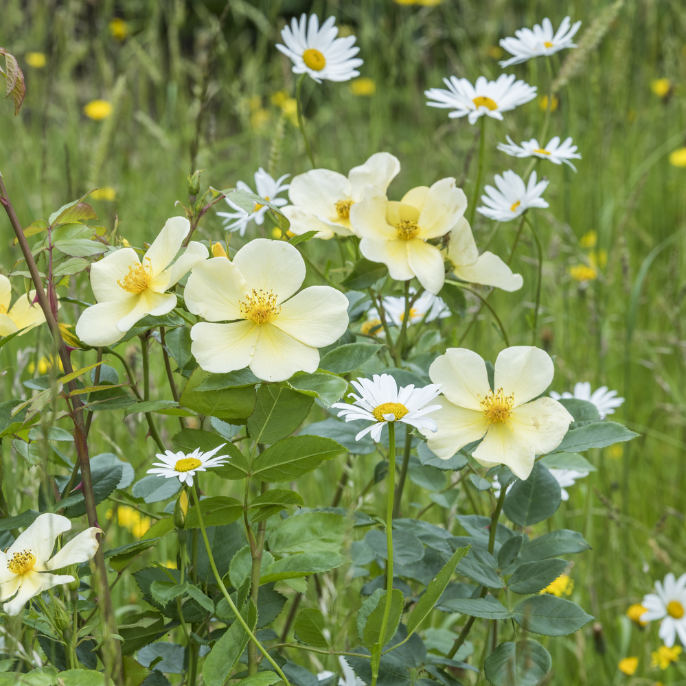 Tottering-by-gently (Auscartoon)A cheerful yellow single rose that’s perfect for pollinators, providing a simple yet elegant addition to any garden.