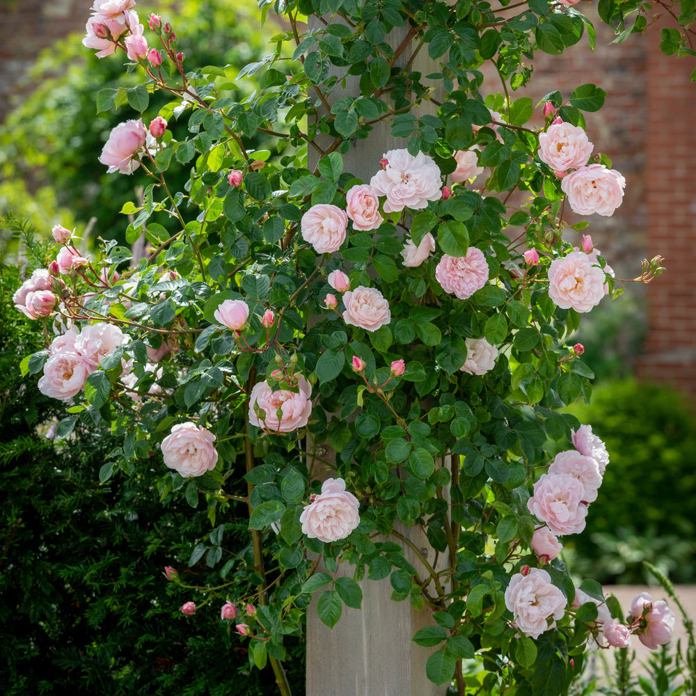 The Generous Gardener® (Ausdrawn)A pale pink rose with a light musk scent, offering open blooms that make it easy for bees to access nectar. Its climbing habit also makes it a graceful feature for walls or pergolas.