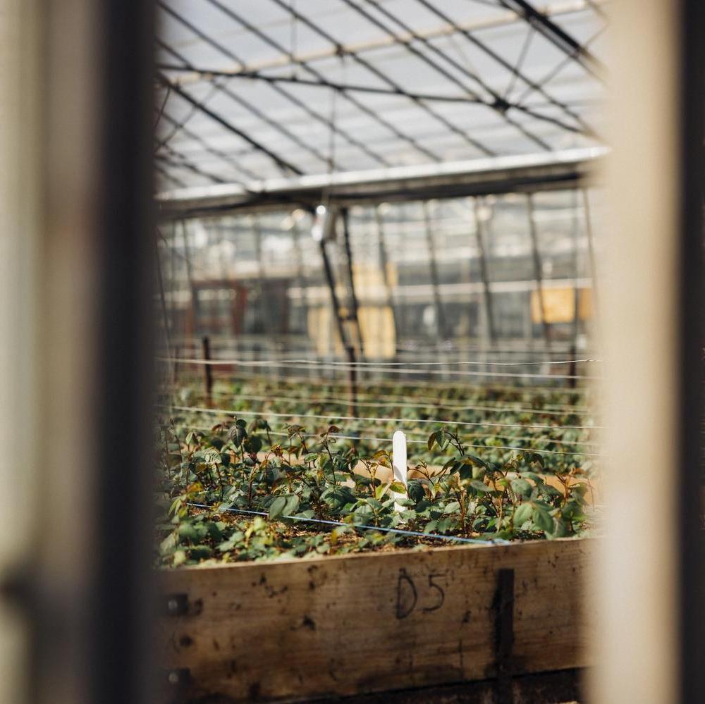 Winter brings a quiet pause as the rose hips are harvested and the seeds inside are cleaned, dried, and stored in cold storage. This mimics the natural winter chill that roses would experience in the wild. Then, come January, the seeds are sown into trays in our greenhouses and are carefully spaced, row after row, quietly waiting for the warmth of spring. Around 350,000 seeds are sown each year, each one unique and full of promise.