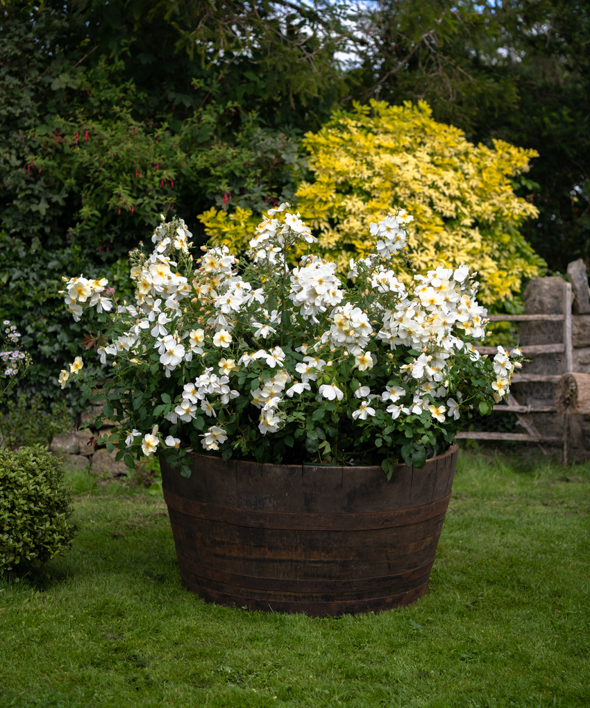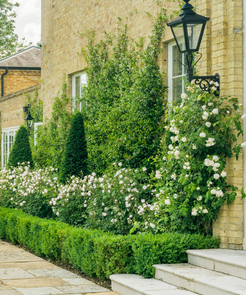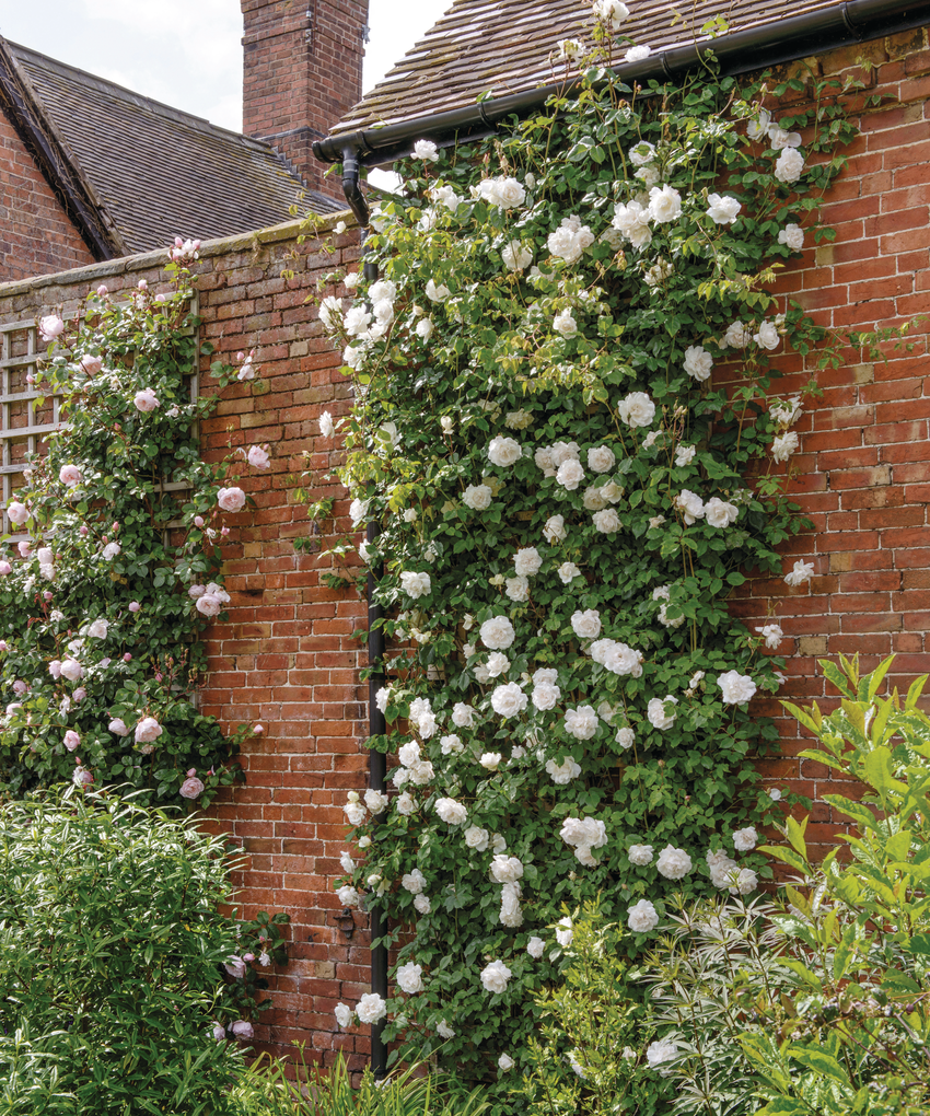 When planning an outdoor space it is important to step back and consider the whole view. Layering a white climbing or rambling rose behind a shrub border will add depth and interest, both up close and from afar.